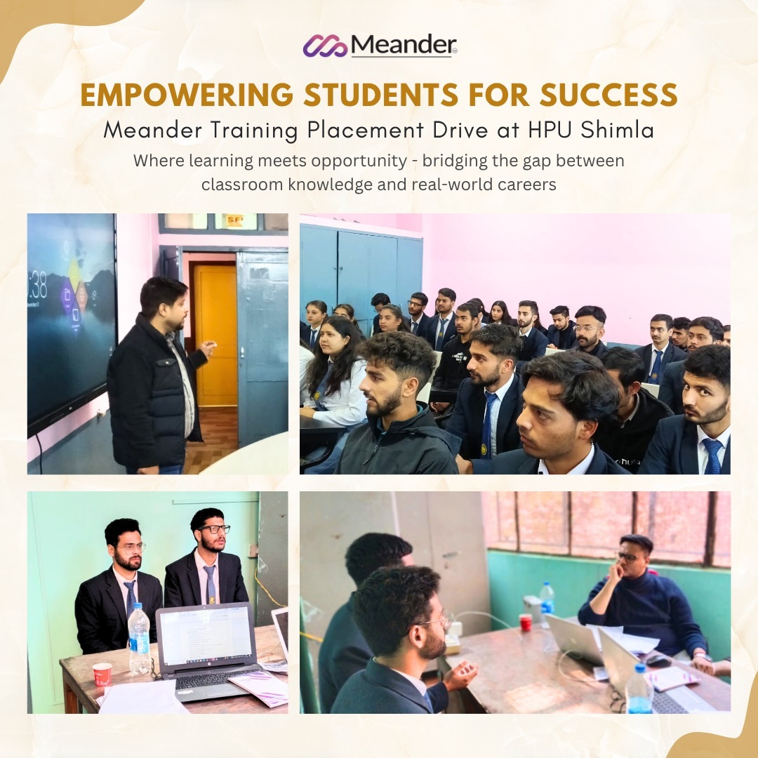 In today’s competitive IT industry, academic knowledge alone is no longer enough to secure top positions. Understanding this, Meander Training recently collaborated with HPU Shimla to conduct a placement drive aimed at providing students with real-world exposure and career-oriented opportunities. The event served as a bridge between theoretical learning and practical applications, allowing students to gain hands-on experience through live projects, internship programs, and interactive sessions.